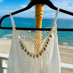 Chic white maxi dress by Zara. Features shell accents. Perfect for beach outings. Measures approximately 18" armpit to armpit - from top of shoulder to length measures approximately 50".