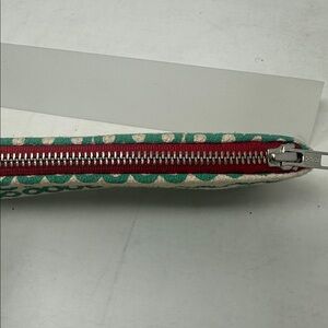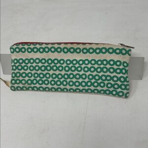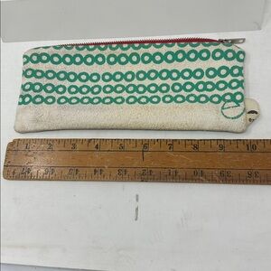Rare early work from Maine screen printer Erin Flett. Vintage small bag in cream with green screen printing and sturdy silver zipper. About 10” x 4”. Shows patina of age with some foxing.