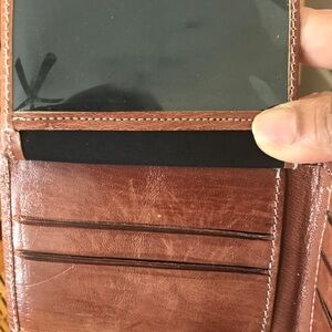 Leather looking wallet. I really don’t know if it’s real leather, so I’m just being on the safe side. Painted horse and saddle. Lots of pockets for id and cards. My son loved all things horses growing up and before he could use this wallet, he grew out of his passion!! Your luck! This wallet would fit into a normal pants pocket.