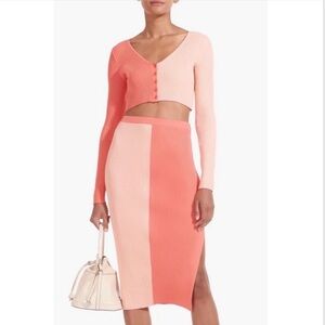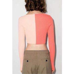 v neckline, ribbed knit material with lots of stretch, long sleeves, two tone pink and coral colors, cropped fit, new with tags, approx measurements shown