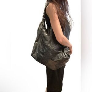 Elegant black tote with a glossy finish. Features a stylish chain accent. Ideal for chic outings.