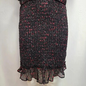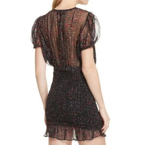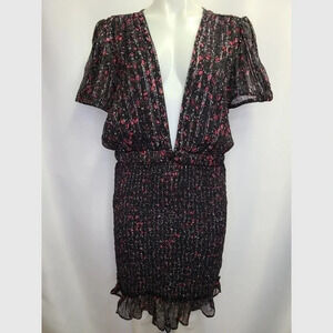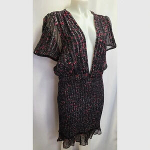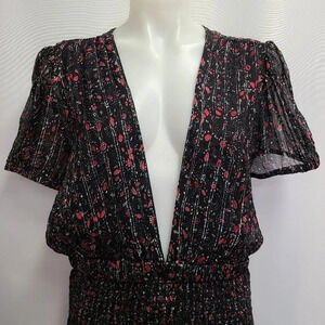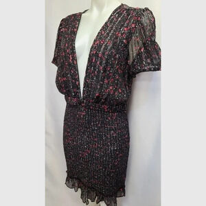 Free People Baby Love Black Smocked Floral Print Black Ded Silver Metallic Floral Print Dress size Large. Black with dainty red, pink and white floral print. Silver metallic thread throughout. Sheer top with plunging V- neckline; wear with cami or bralette. Slightly puffed short sleeve. Smocked bodycon pencil skirt with stretch; fully lined skirt. Ruffle hem. Stretch waistband. 98% Rayon, 2% spandex. New with tags, in new condition.