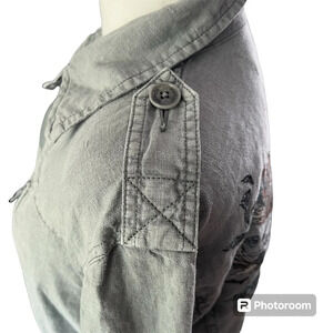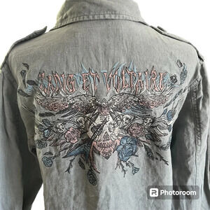 Light blue linen military jacket with wings and skull pattern on the back.