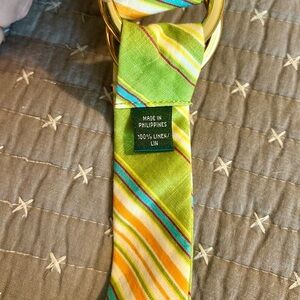 Vibrant green belt with colorful stripes. Features a stylish gold buckle. Perfect for adding flair to any outfit. Spot on one side of belt. See pic.