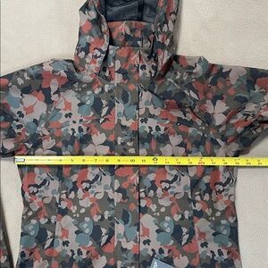 Durable jacket with a camouflage pattern. Features a hood and breathable mesh lining. Ideal for outdoor activities.