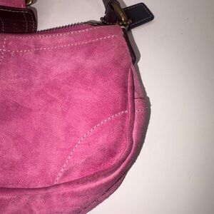 Authentic Coach Vintage Y2K Mini suede pink 🩷 bag! Chic and stylish pink leather shoulder bag with elegant buckle detailing. Perfect for any occasion. Has original hangtag! Brass hardware! Zipper closure and open pocket inside.