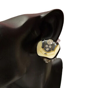 Beautiful vintage clip on earrings with a cream and black color and art deco style design. Earrings are accented with lovely glass crystal stones. Earrings are made of celluloid a popular material in vintage jewelry not used anymore. Earrings measure 1 inch in diameter. Great condition.