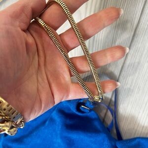 The electric blue is so eye catching with the gold accents on the arms.