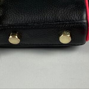 Black pebbled leather bag with hot pink accents and gold hardware. Good pre-owned condition with some wear showing along the piping. Lining is clean and strap is in great condition. Perfect pop of color!