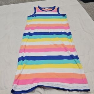 Stylish tank dress with a blue neckline and peach colorful striped body. Ideal for everyday wear. super soft 100% Cotton size Girls 12