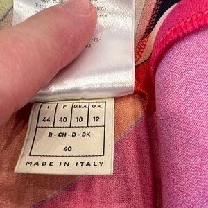 Bold silk scarf with dynamic wave design. Features pink, orange, and yellow hues.
