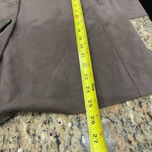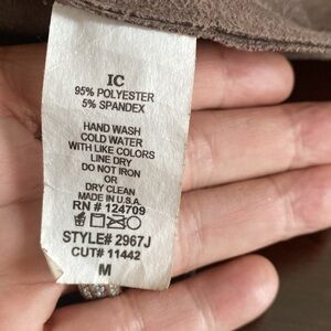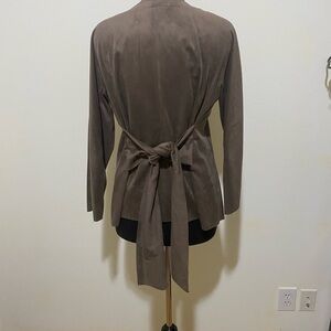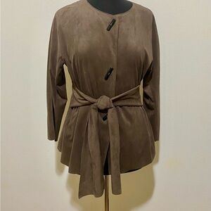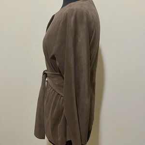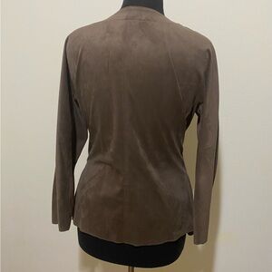 Stylish brown jacket. Perfect for any occasion. Unlined. Unfinished hem and sleeves is intentional. Suede like. Very soft material. One very light blemish on front right side as photograph. I didn’t notice until measuring. Measurements in photos are part of the description. Offers and questions welcomed. 0601