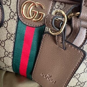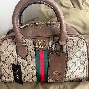 Stylish Gucci satchel featuring iconic beige and brown design. Accented with green and red stripes. Ideal for a chic look.