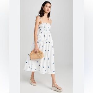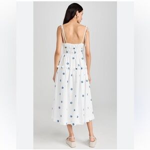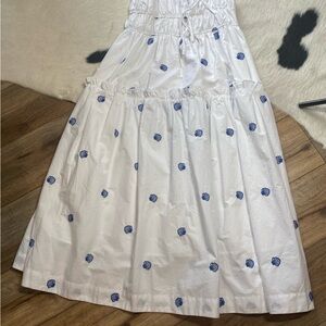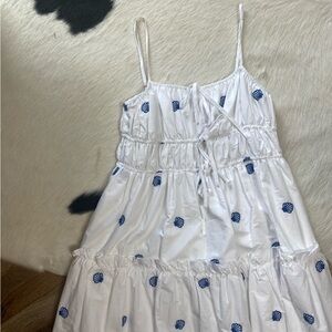 This dress is a midi-length sundress with a white background and an embroidered seashell pattern in blue. The key features include: