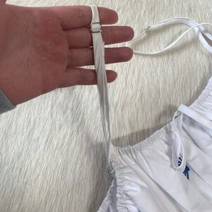 Design: A square neckline, tie shoulder straps, a smocked or shirred bodice, and a tiered skirt with ruffle trim.
