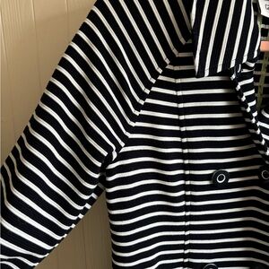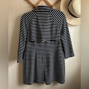 Chic knit jacket with navy and white stripes. Perfect for layering.