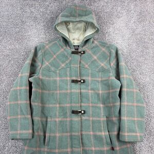Woolrich Duffle Coat Women's Large Green Plaid Hooded Toggle Wool Blend 15606