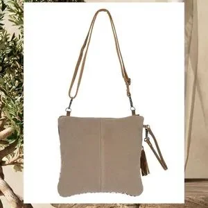 Chic crossbody with a tan and cream pattern. Ideal for daily wear. Combines style and practicality.