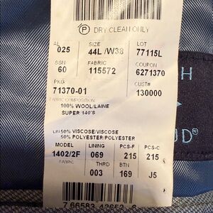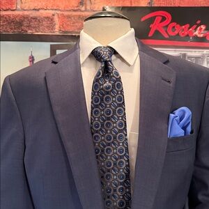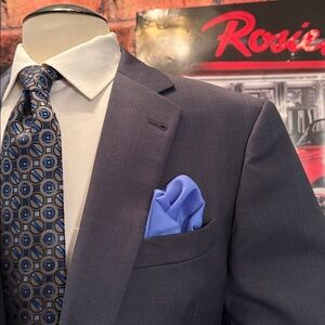 Sophisticated Sport jacket by Joseph Abboud. Size 44 Long color medium blue all 100 % lightweight Italian wool made in the USA , worn twice and in Excellent condition like New . Fully lined notched lapel flap pockets 2 buttons front and Side Vents Ideal for business or formal events. Or Casual wear with jeans and open collar shirt. Armpit 23 , sleeve length 26, Coat length 32.5 , shoulder 21 accessories and shoes Not included Only the Sport Coat, Men’s Wearhouse price $ 599