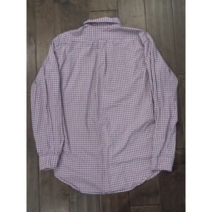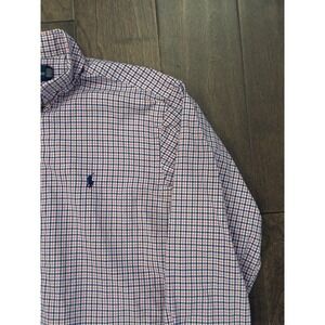 This Ralph Lauren men's shirt in size M features a classic fit and a pink check pattern with navy polo pony accents. Made of breathable cotton fabric, this button-up shirt has long sleeves and a collared neckline, making it suitable for all seasons. The shirt embodies a preppy, classic outdoor style, perfect for casual occasions with a touch of 90s nostalgia.