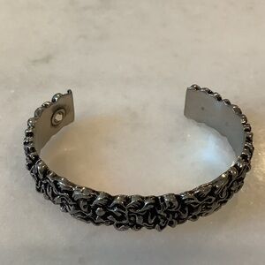 Intricate silver design with an antique finish by Gucci. This cuff style bracelet slips onto your wrist and features a textured design reminiscent of a lion’s mane. A crystal and Gucci brand on the inside. Adds elegance to any look. Perfect for special occasions.