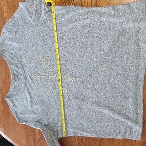 2X Falls Creek gray sweater with a sparkly snowflake design. Approx. 25" across chest, 26" from shoulder to hemline. Good used condition, smoke-free and pet-free home. 57% polyester, 40% rayon, 3% spandex.