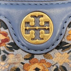 NWOT The Tory Burch T Monogram Brocade Studio Bag in Sea Frost blends refined craftsmanship with contemporary design. Its intricately woven brocade fabric showcases the iconic T Monogram, adding texture and subtle sheen to the accessory.