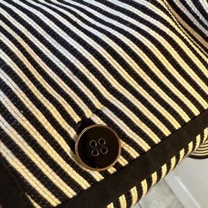This elegant blazer from Talbots showcases a timeless black and white stripe pattern, offering a sophisticated and versatile look. Its collarless design and structured silhouette make it perfect for both professional and casual occasions. Crafted with attention to detail, this piece ensures comfort and style throughout the day.