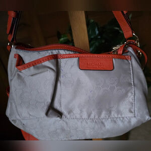 This coral shoulder bag from Michael Kors features a sleek leather finish and charm detail. Designed for style and practicality, it has a structured silhouette. In excellent condition; see photos.