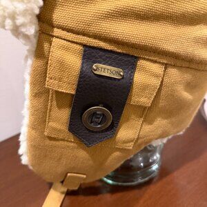 STETSON men's faux fur sherpa trapper hat with sherpa trim on brim, ear flaps, and back of neck. Shell is a canvas-like material in a mustard beige color; sherpa is off-white/cream; interior quilted material is black. Straps have an adjustable buckle closure. Excellent pre-loved condition.