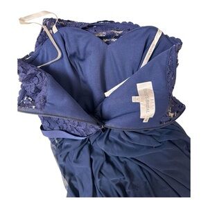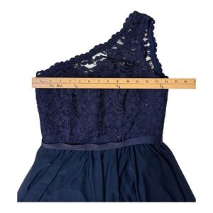 Charming navy dress with lace bodice. Perfect for formal events. One-shoulder design adds elegance.