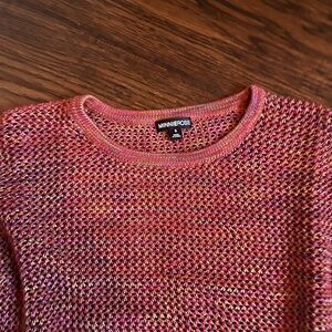 Never worn netted sweater. Colors are rust with a little yellow and little pink. Really cute. Size small