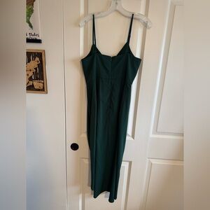 Chic high low dress in forest green. Features a sleeveless design with a stylish slit. Perfect for elegant occasions.