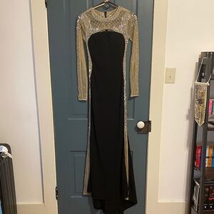 Chic black gown with shimmering pearl and crystal beading. Long sleeves and elegant design. Perfect for formal events.