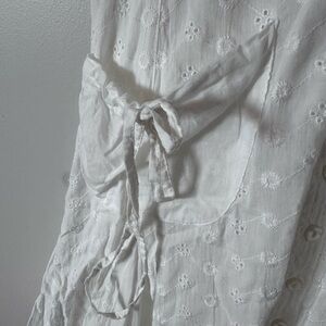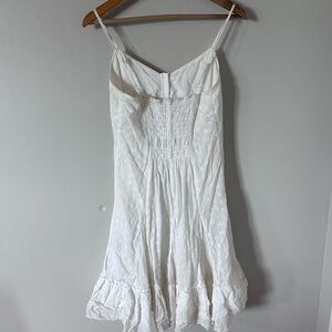 Chic white sundress with button-down front. Features delicate straps and ruffled hem.