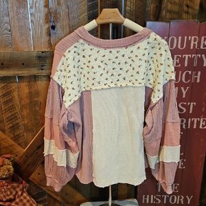 Stylish pink blouse with cream patchwork. Features floral accents and textured fabric. Ideal for casual wear. nwot