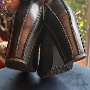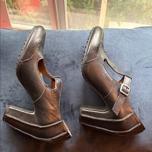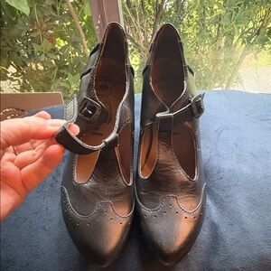 Fly London pumps • black leather • unique vintage style heels • great condition • leather covers complete heel • adjustable buckle • barely worn • size 39 • out of stock