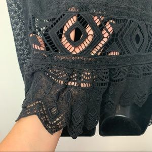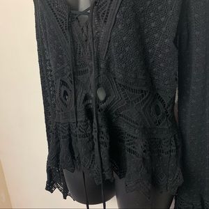 Elegant black lace knit top. Features intricate patterns and tie front. Long sleeves with flared cuffs.