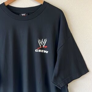 Black crew t-shirt given to workers of the May 2011 Extreme Rules event for the World Wrestling Entertainment group. New and unworn/unwashed, no tags. Size 2X, approximately 26” pit-to-pit lying flat, 32.5” from the top of shoulder to bottom hem.