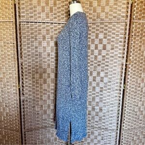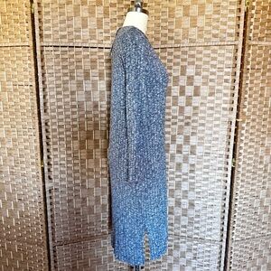 New, never worn. Black+white=marled gray ribbed stretch knit. Rayon+poly+spandex blend, super soft, feels wonderful. Lined! Crew neck, long sleeves, side slits. Made in the USA. Size M, photographed on a size 8 dress form, will best fit an 8 or 10. About 43” long. Pic #1 is a stock photo.
