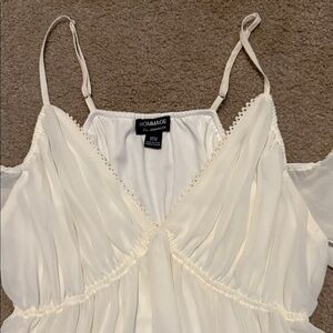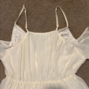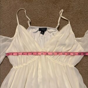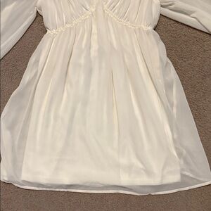 Elegant cream mini dress with delicate straps. Flowy design with long sheer sleeves. Perfect for any occasion.