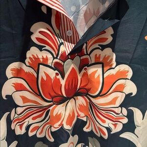 Elegant floral top by Cherybetty. Features bold orange and cream patterns. Striped collar adds a chic touch.