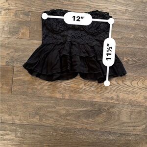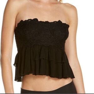 Chic strapless top with lace cup detailing and tiered ruffles and hem added style. Perfect for a night out, paired with leather skirt or dress pants. Also cute with a pair of jean shorts and sneakers. Excellent brand new condition. Ink mark on tag. See photos for measurements.