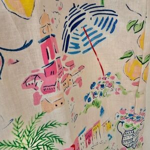 Adorable beach tropical print with lemons, palm trees, beach umbrellas, Santorini-style buildings, sun hat, sunglasses, flowers, and Grecian urns.