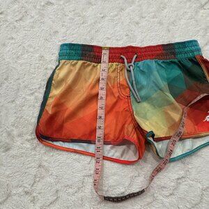 Brand new! Amazing board shorts or beach coverup shorts that could easily also be used as regular athletic shorts. Features a rainbow ombre warm and cool toned geometric pattern, with an elastic waistband and metal-capped drawstring with the Surf Cuz logo. The back velcro pocket is usable! Wonderful piece for beach days that can easily match any solid colored swimsuit. Would look super cute, too, with a flowy styled coverup top at the beach!