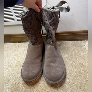 Warm and stylish UGG boots with knit design. Ideal for winter wear. Super cute and can create cute bows.