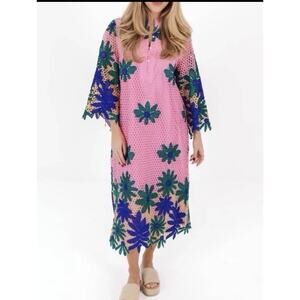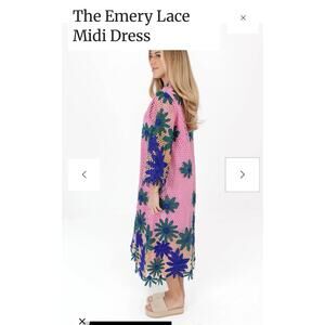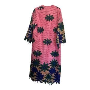 The NWT $228 J Marie Emery Lace Midi Dress is a beautifully crafted floral embroidered dress perfect for various occasions such as weddings, parties, or casual events. Featuring long flared sleeves, a high neckline with a button closure, and a shift style silhouette, this dress is both stylish and comfortable. The dress is lined for added sophistication and is made from a combination of 100% polyester outer material and 100% cotton lining for a luxurious feel. Perfect for the summer and spring seasons, this dress is a must-have for any fashion-forward woman.