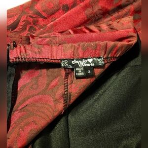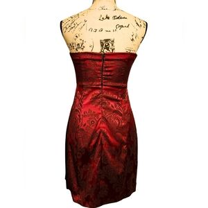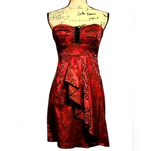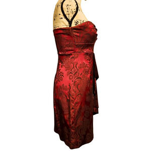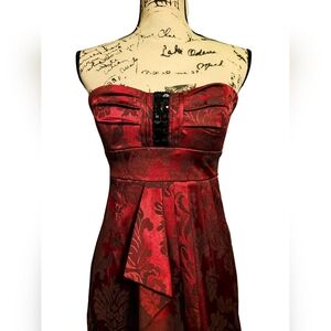 Elegant strapless dress by Sequin Hearts. Vibrant red with black accents.