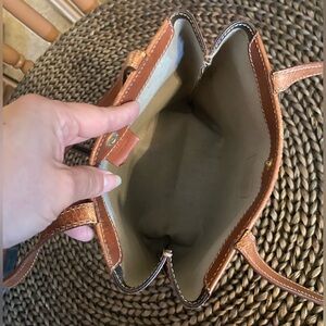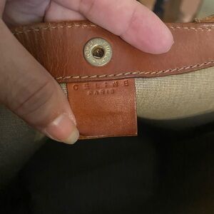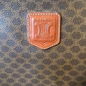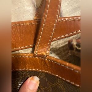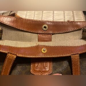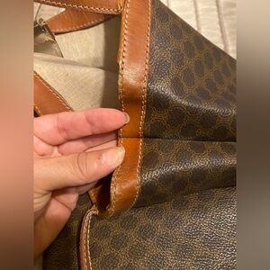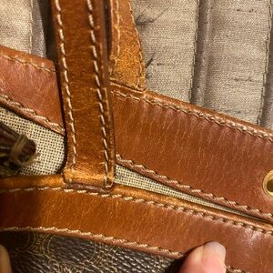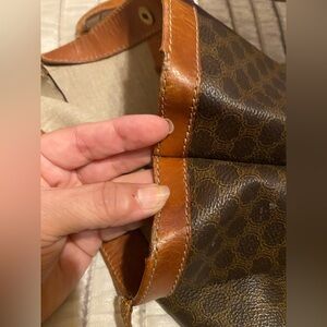Vintage Celine Macadam tote with a classic pattern. Features sturdy tan handles. Ideal for daily use.