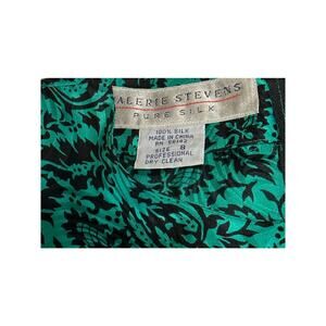 Valerie Stevens Pure Silk knee-length dress in a gorgeous emerald green with tiered skirt and black design! Vintage dress with shoulder pads, definitely a retro one-of-a-kind piece. In great condition, size 8 but see exact measurements below!